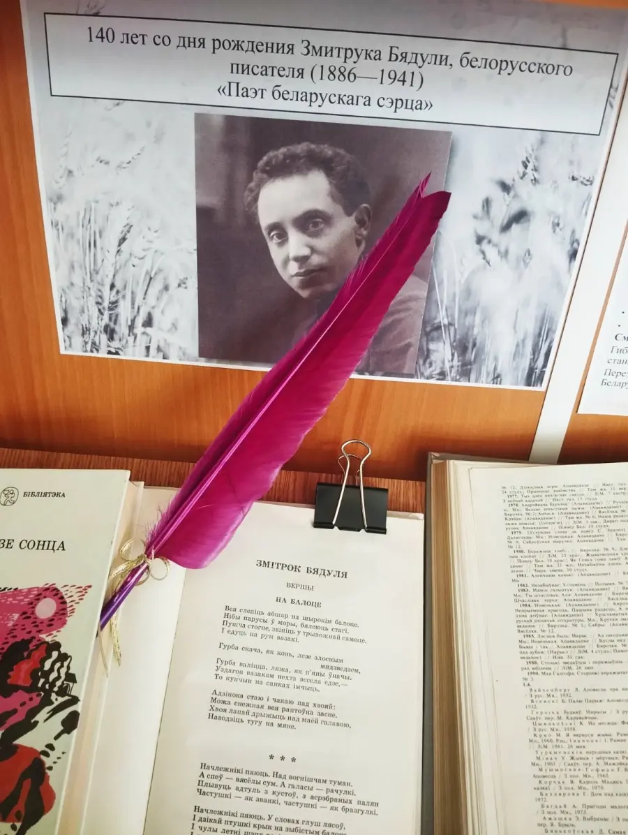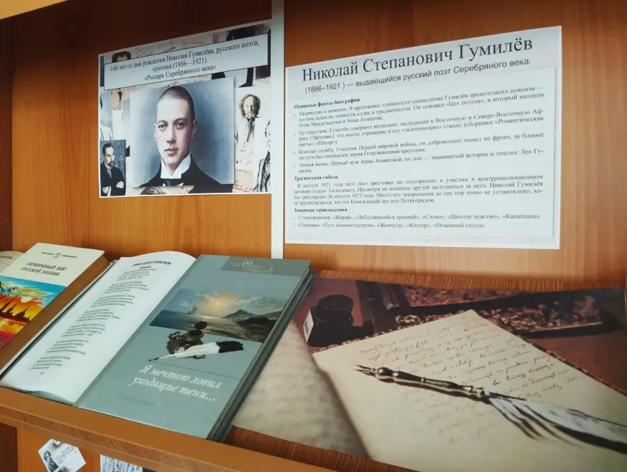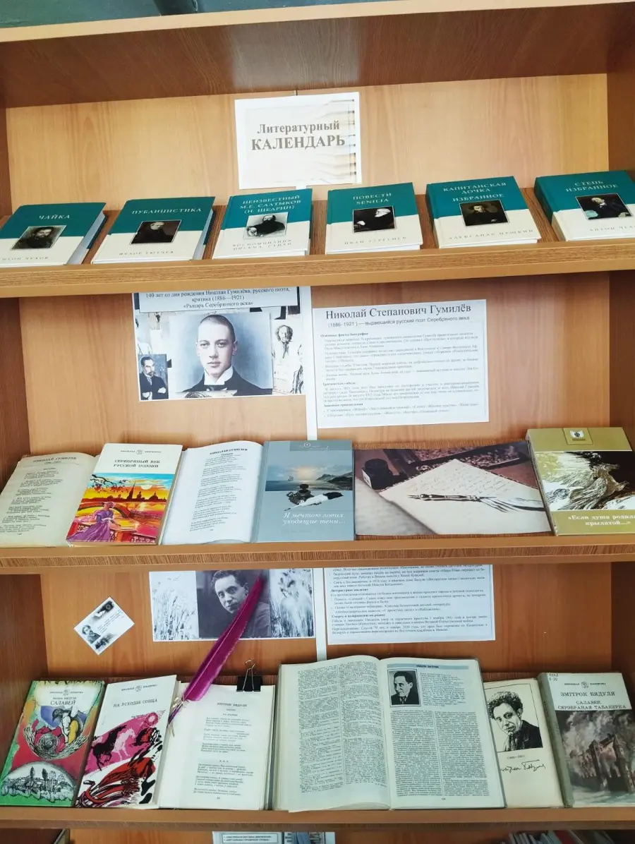 📚📖📕В рамках юбилеев выдающихся мастеров слова были подготовлены книжные выставки: «Рыцарь Серебряного века», посвящённая 140-летию со дня рождения Николая Гумилёва (1886—1921), русского поэта и критика, а также «Паэт беларускага сэрца» к 140-летию со дня рождения Змитрука Бядули (1886—1941), талантливого белорусского писателя. На выставках представлены поэтические и прозаические произведения юбиляров: стихи, критические статьи и сборники Николая Гумилёва, а также рассказы, сказки и стихотворения Змитрука Бядули.