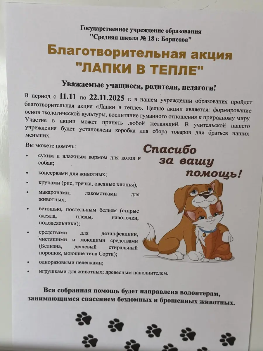 Активно включились в участие в благотворительной акции "ЛАПКИ В ТЕПЛЕ" по сбору помощи приюту для животных учащиеся всех классов нашей школы @school18_barysau . Ребята принесли корма, моющие средства, подстилки и игрушки для животных. Всё это будет передано в приют, где бездомные пушистики в передержке, пока им найдут добрых хозяев, нашли кров.