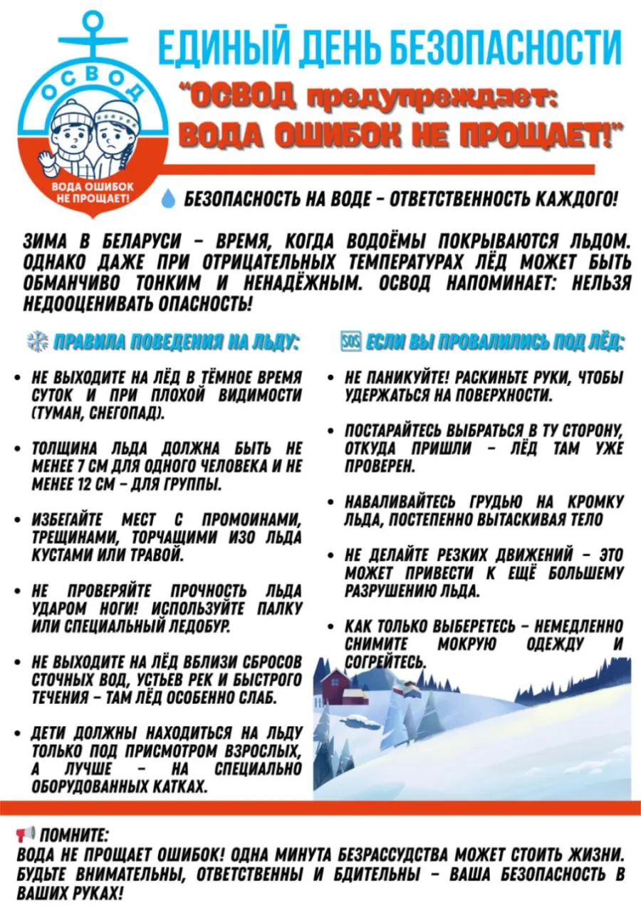 11 декабря в нашей школе в рамках Дня безопасности на водах был проведён День безопасности на льду. Для учащихся активистами ПО ОСВОД из 9 "В" были подготовлены и проведены минутки безопасности на тему "ОСВОД ПРЕДУПРЕЖДАЕТ: ВОДА ОШИБОК НЕ ПРОЩАЕТ!"