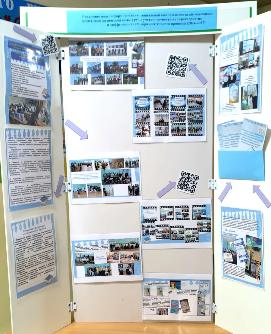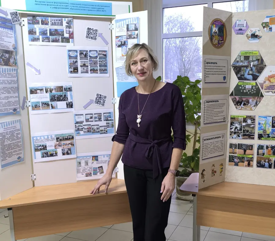 Стендовую информацию о ходе реализации инновационного проекта «Внедрение модели формирования социальной компетентности обучающихся средствами физической культуры с учётом личностных характеристик и дифференциации образовательного процесса» представила Минина Е.М., учитель физической культуры и здоровья.
