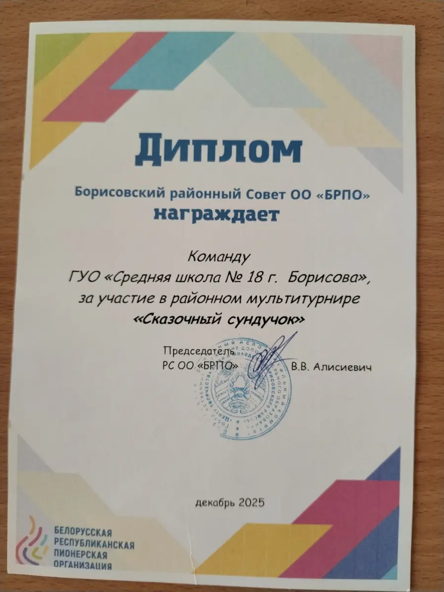 Участие команды 3 А класса '"Мандаринки" в районном мультитурнире "Сказочный сундучок" принесло нашей команде позитивный предновогодний настрой и Диплом Борисовского районного Совета ОО БРПО! 🥁🥁🥁