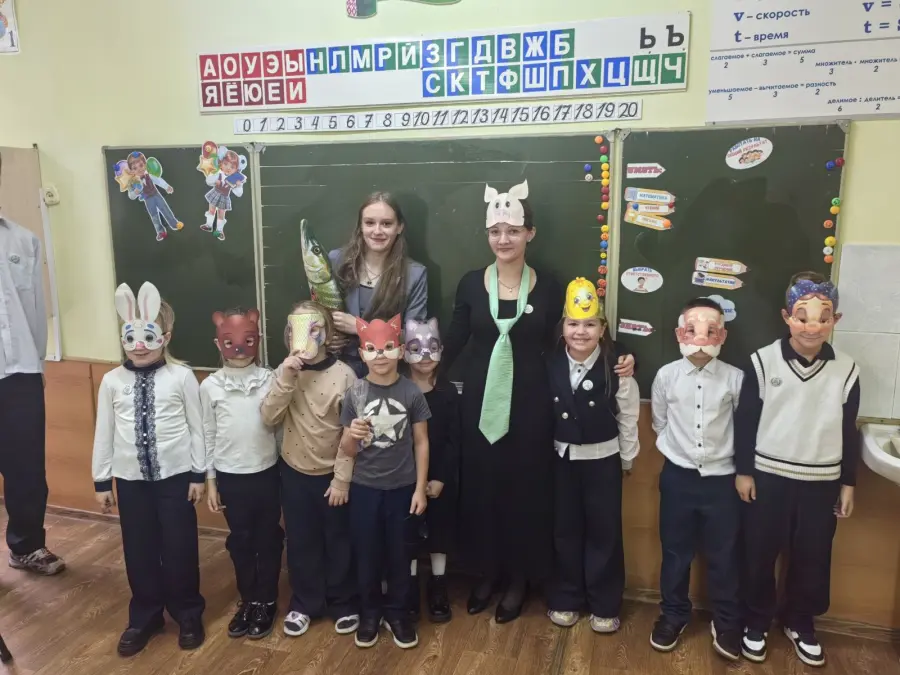 Учащиеся 10А класса занимаются в педагогической группе и ко Дню учителя подготовили и провели серию уроков в начальной школе в рамках своих первых педагогических проб.