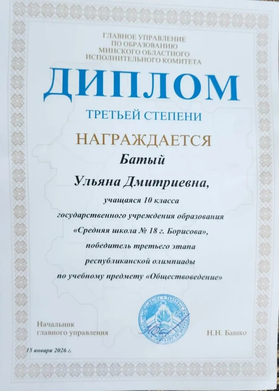 Поздравляем Батый Ульяну - победителя 3 этапа республиканской олимпиады по учебному предмету "Обществоведение" и её учителя Кондик Наталью Геннадьевну!!!