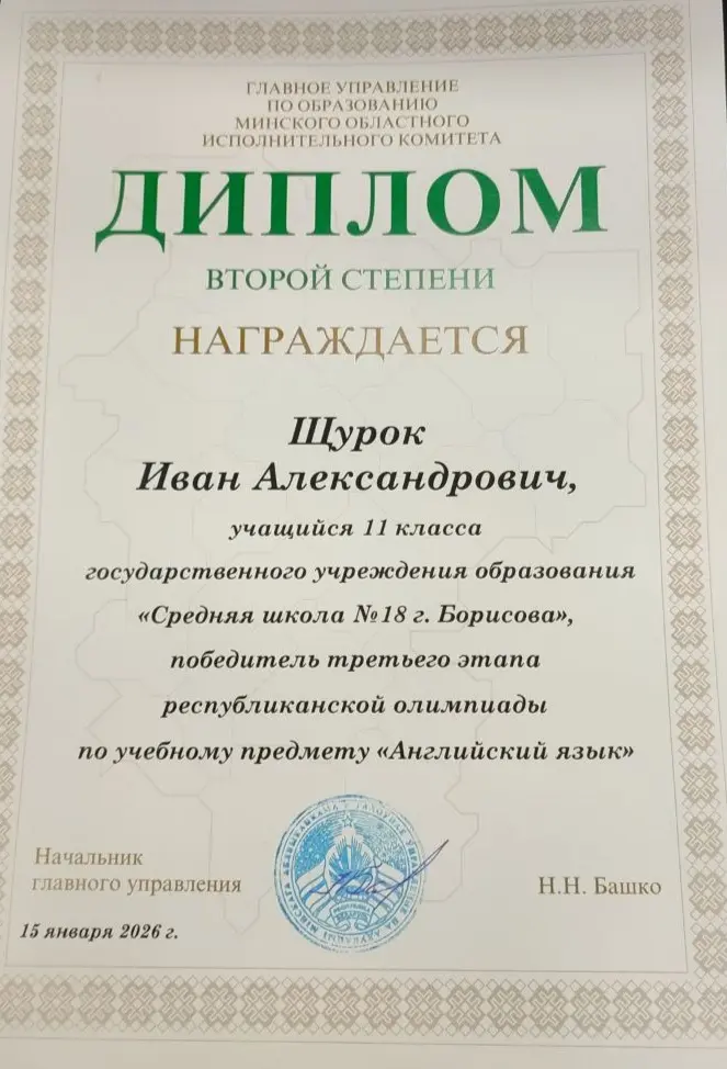 Поздравляем Щурка Ивана - победителя 3 этапа республиканской олимпиады по учебному предмету "Английский язык" и учителя Горелову Инну Ильиничну!!!