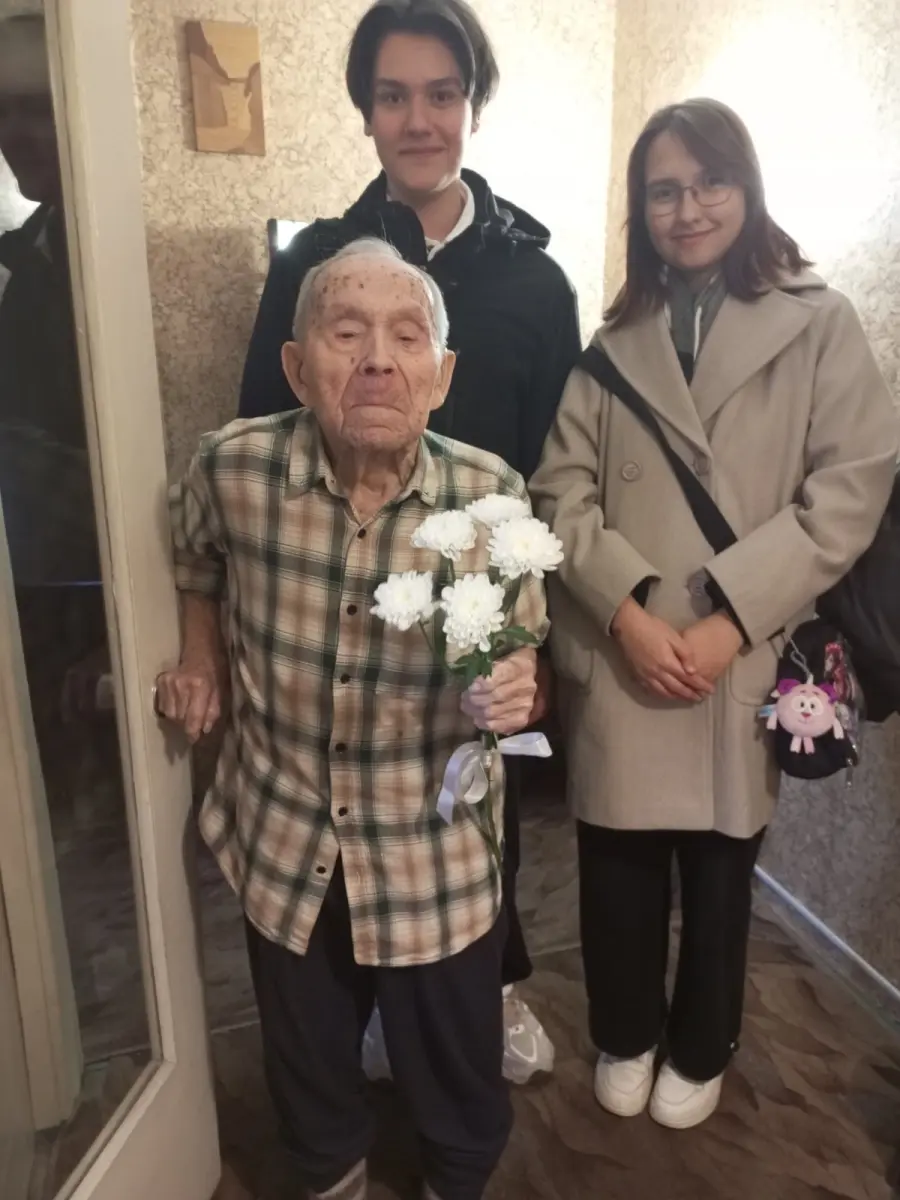 Учащиеся 10 Б класса поздравили ветерана Великой Отечественной войны, Власова Андрея Игнатьевича, со 100-летним юбилеем и Днём пожилого человека.
