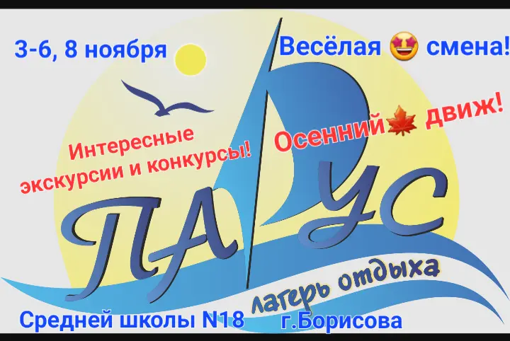 Лагерь отдыха "ПАРУС" с дневным пребыванием открывает свои двери в стенах средней школы N18 г.Борисова на осенних каникулах с 3 по 6 и 8 ноября. Ребят ждут интересные конкурсы и экскурсии, весёлая смена!