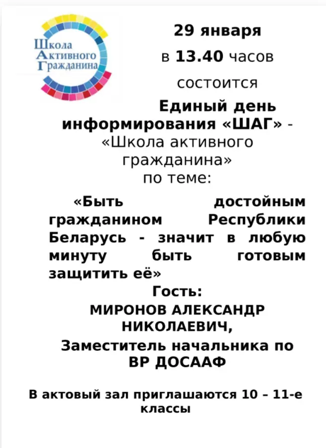 Заседание 29 января пройдёт по теме "Быть достойным гражданином Республики Беларусь - значит в любую минуту быть готовым защитить её"