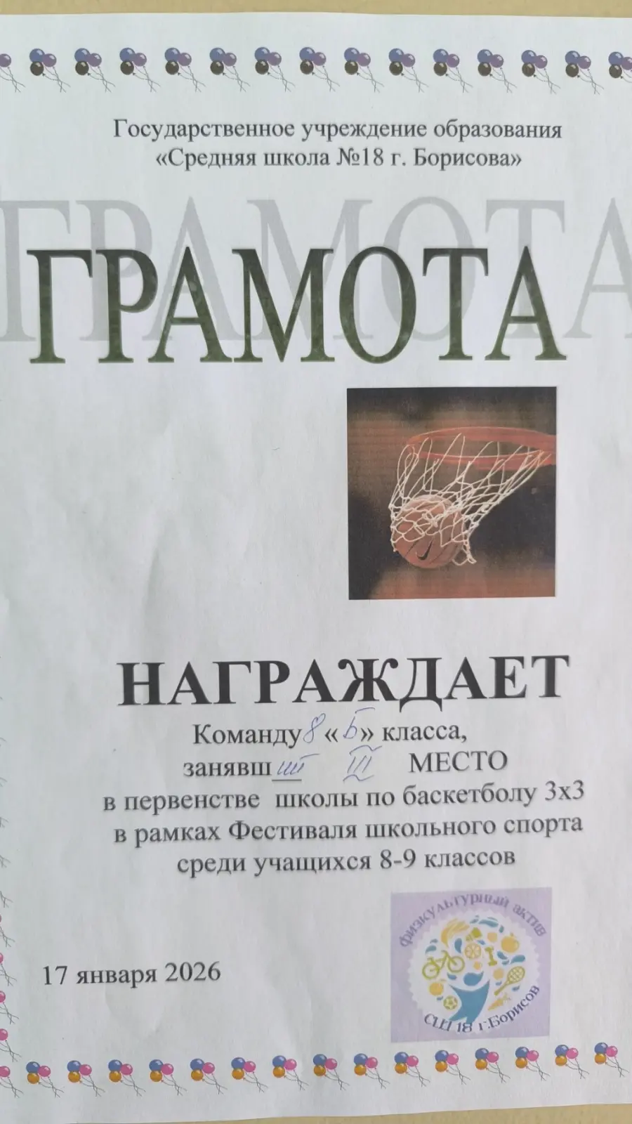 17 января в рамках проведения Фестиваля школьного спорта в спортивном зале прошли соревнования для 8-9 классов по баскетболу 3х3.