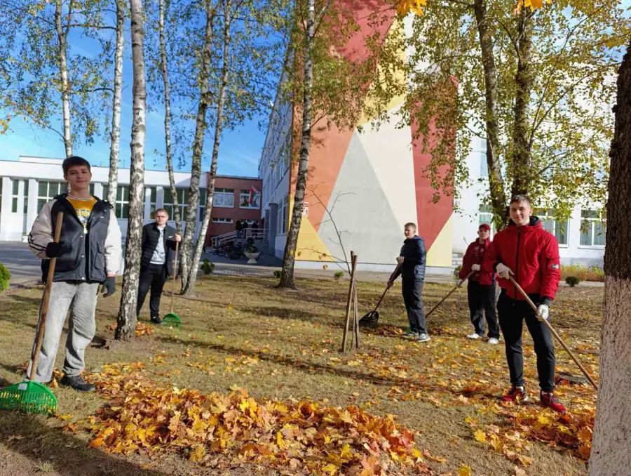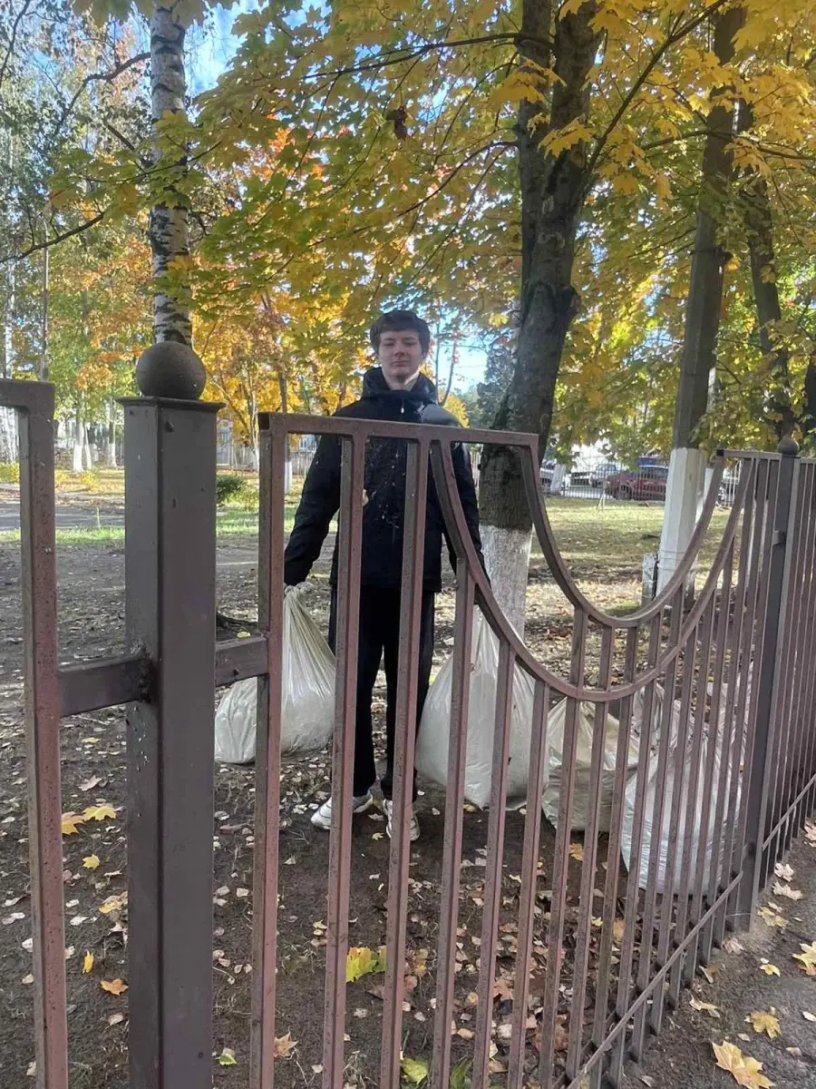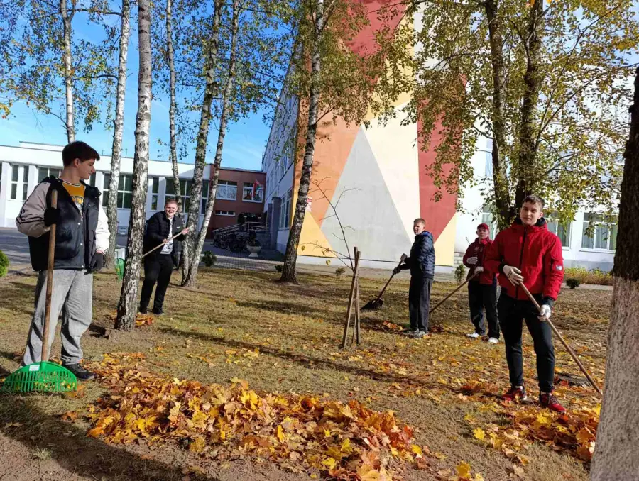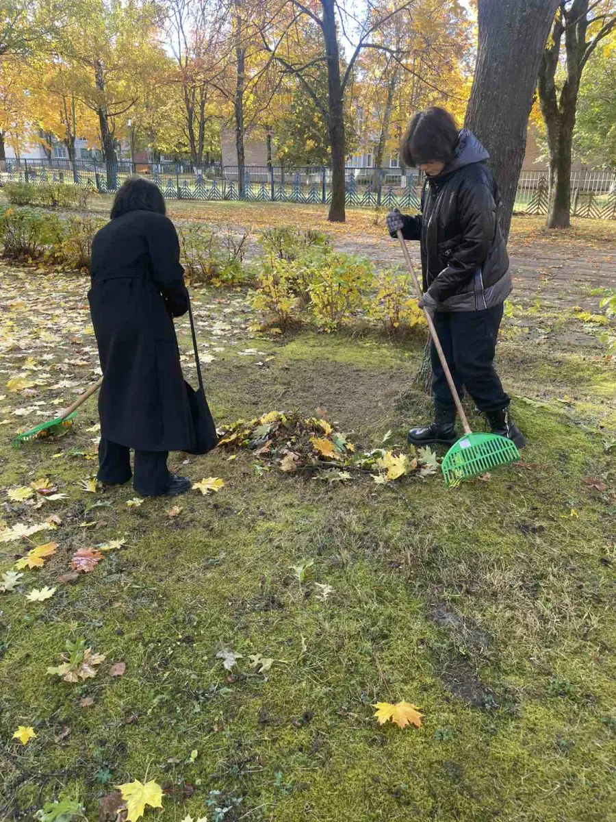 Ребята собирали листву в кучи, ссыпали в мешки и грузили в специальный контейнер. Девятиклассники приводили в порядок школьный двор и цветники.