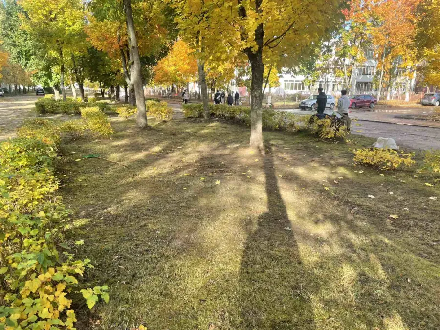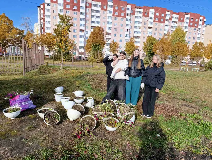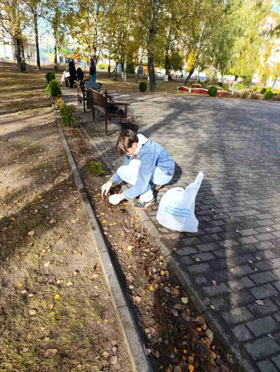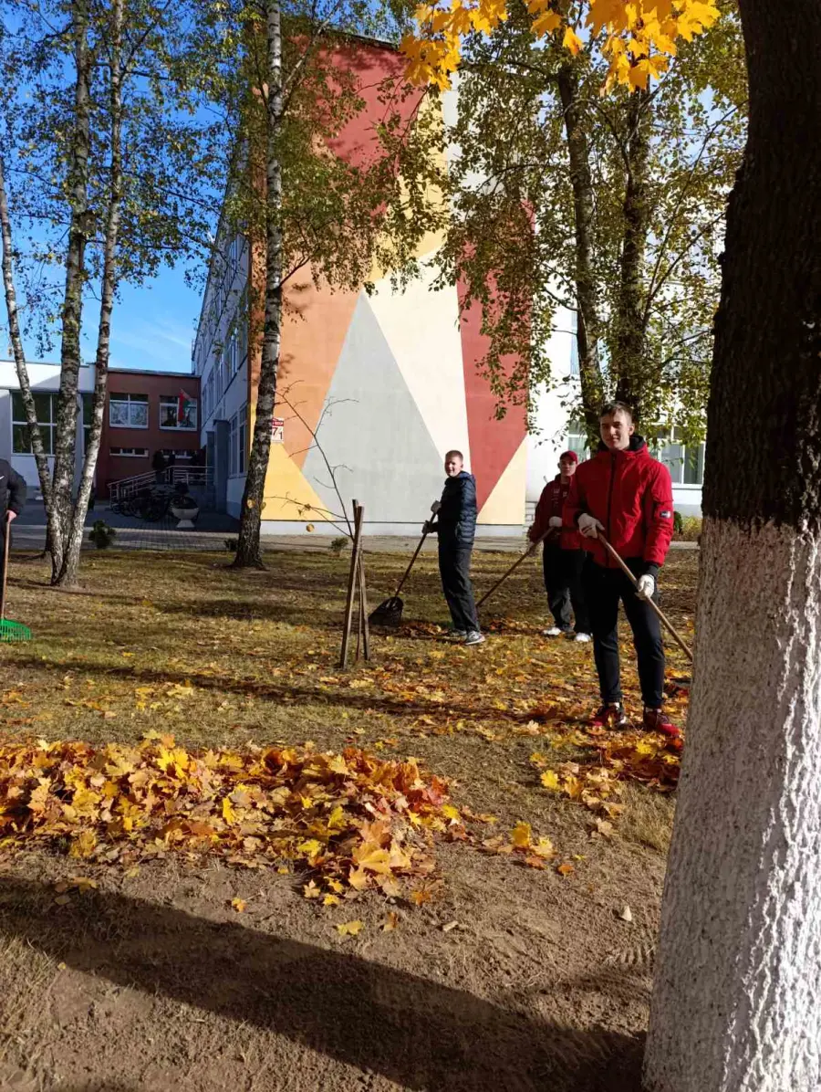 Ребята собирали листву в кучи, ссыпали в мешки и грузили в специальный контейнер. Девятиклассники приводили в порядок школьный двор и цветники.