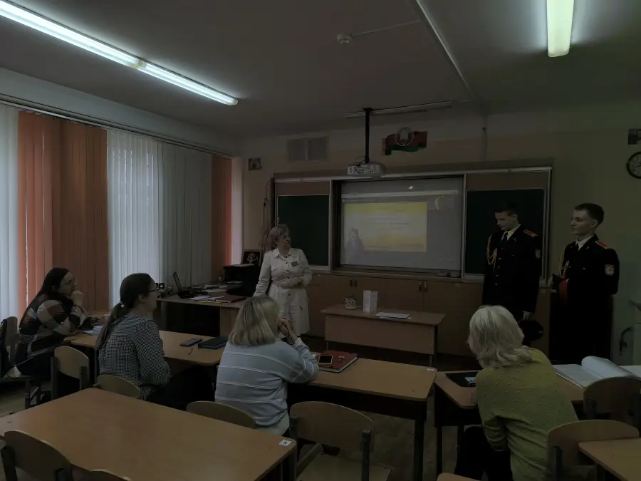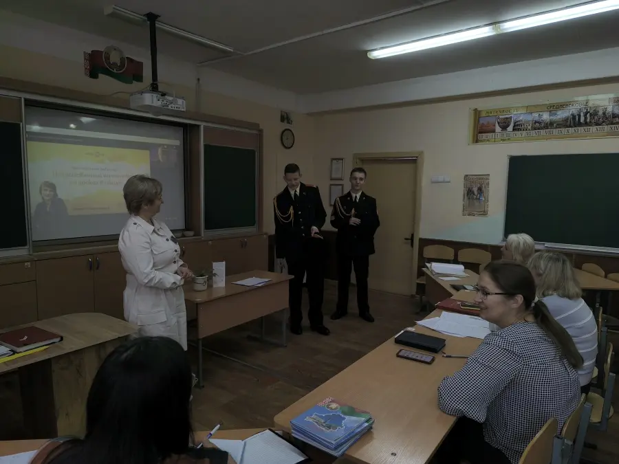 На УМО учителей-филологов Шваб Зоя Николаевна поделилась опытом работы по использованию активных методов и приемов по формированию гражданственности, патриотизма на уроках русского языка и литературы. Интересным и трогательным моментом была встреча с курсантами кадетского училища (г. Слуцк).