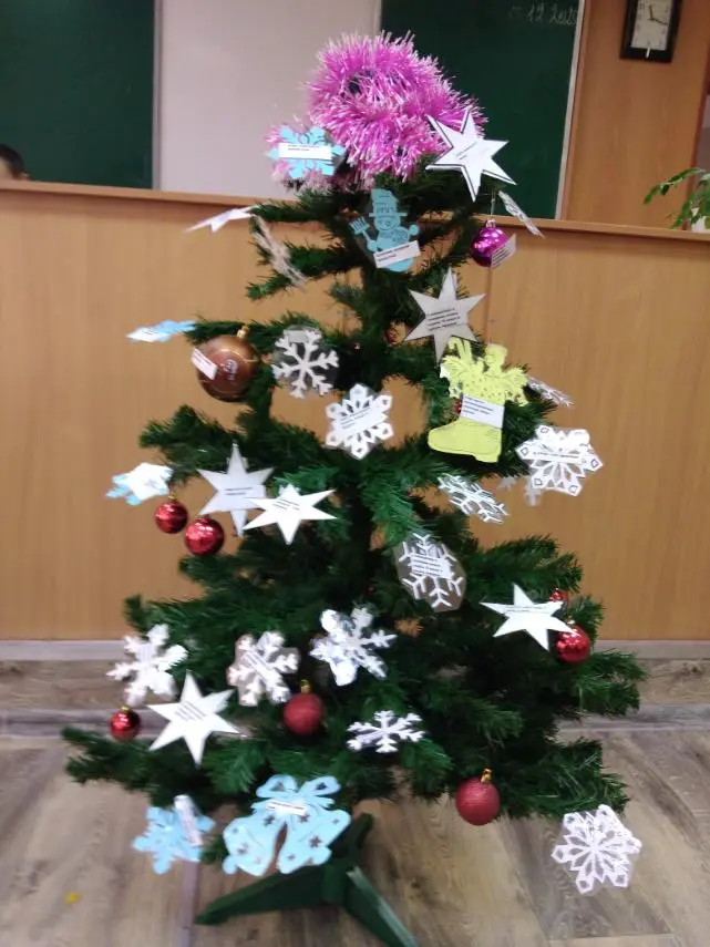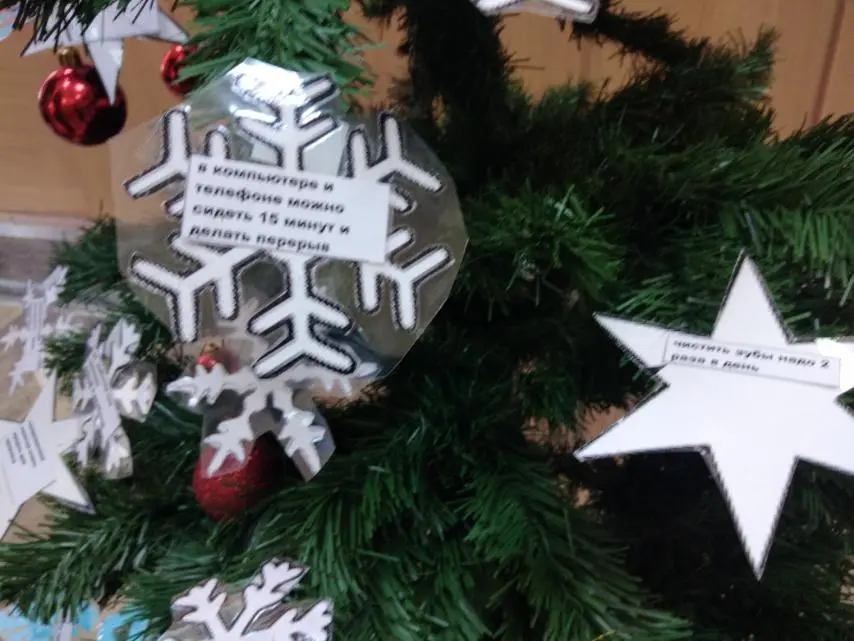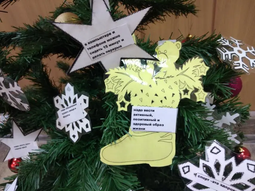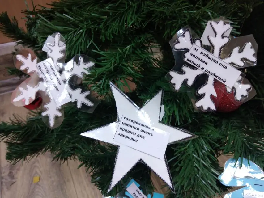 Разговор шёл и о режиме дня, и о гигиене, и о питании, и о двигательной активности, и, конечно, о вредных привычках. Затем пятикласники наклеили листочки с заповедями ЗОЖ на снежинки и шары и украсили елочку. Таким образом, появилось "Дерево здоровья", а точнее, "Ёлочка здоровья", которая на протяжении всех новогодних праздников будет хорошим напоминанием, что здоровье - самое ценное, что есть у человека.